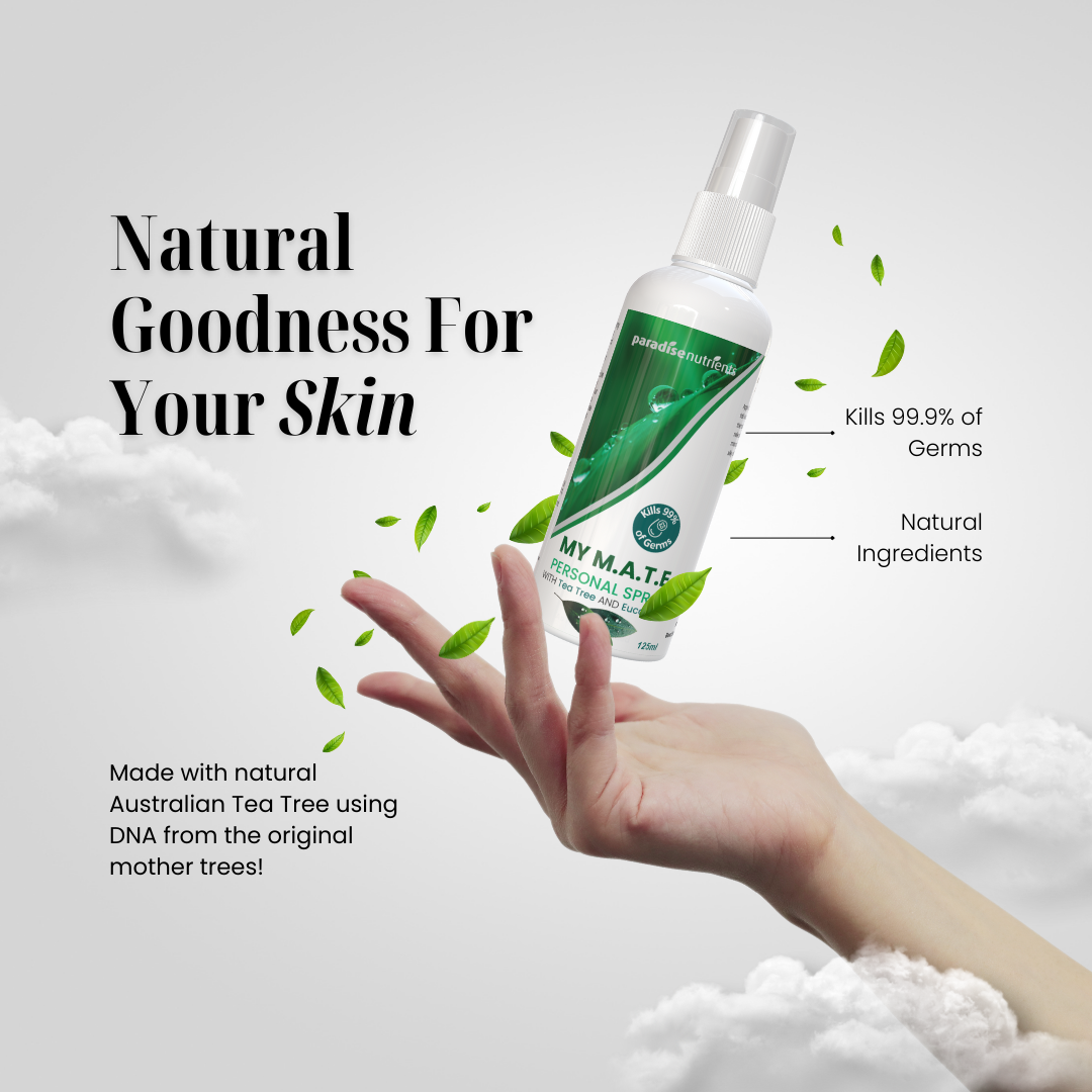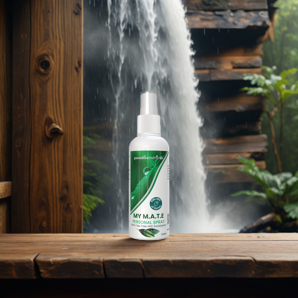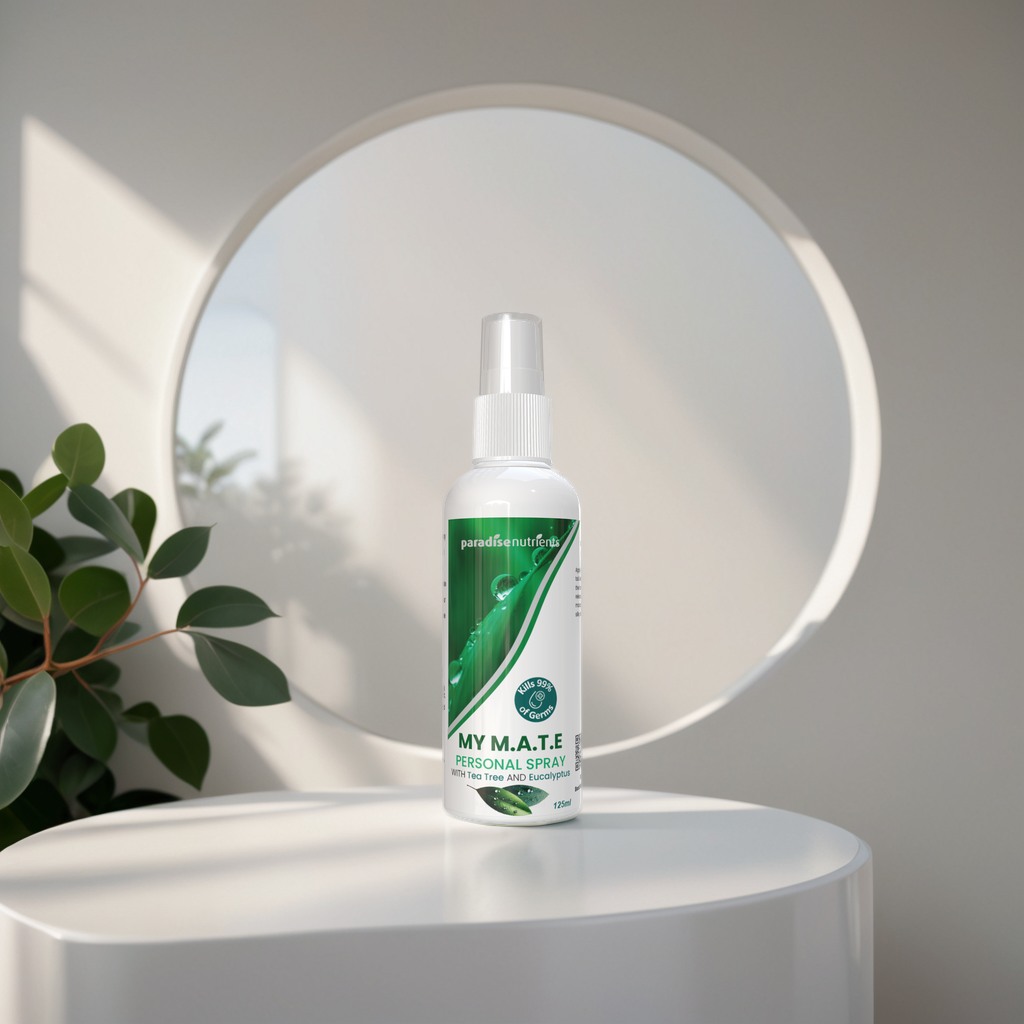 My Mate Personal Spray is a powerful blend of Australian Tea Tree, Eucalyptus, Lemon, Citronella oil extracts, Liquid minerals, and Aloe Vera. This remarkable spray isn't just your average skincare product – it's a natural anti-bacterial and anti-viral powerhouse that not only repels insects but also combats free radicals, promotes wound healing, and revitalises your skin's tone and texture. With roots deeply embedded in the Indigenous Australian heritage, the potent combination of Tea Tree and Eucalyptus brings centuries of proven skin healing, pain relief, and immune-boosting benefits.