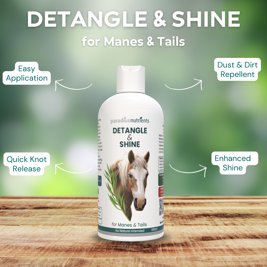 Apply to clean, dry coat, mane or tail. Massage a small amount into the hair to condition and instantly release knots. After thorough massaging, comb well until a rich, silky shine is achieved.