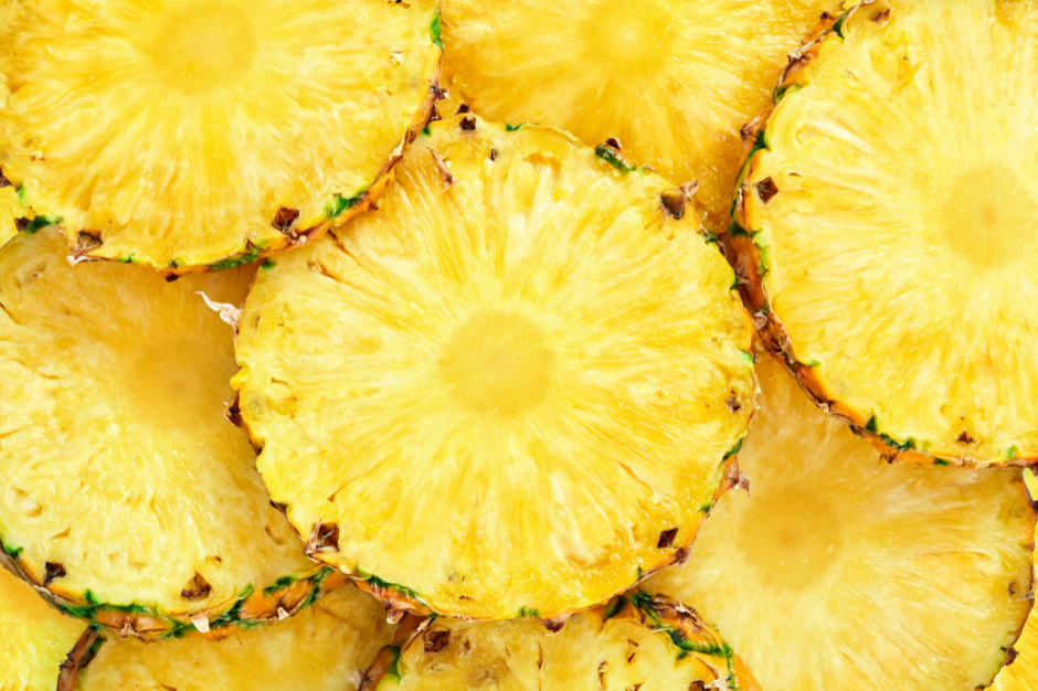 Ananas sind eigentlich nicht nur eine Frucht, sondern eine Ansammlung von vielen Blüten, deren einzelne Früchte um einen zentralen Kern herum miteinander verwachsen sind. Jede Frucht ist an einem „Auge“ zu erkennen, der rauen, stacheligen Markierung auf der Oberfläche der Ananas.