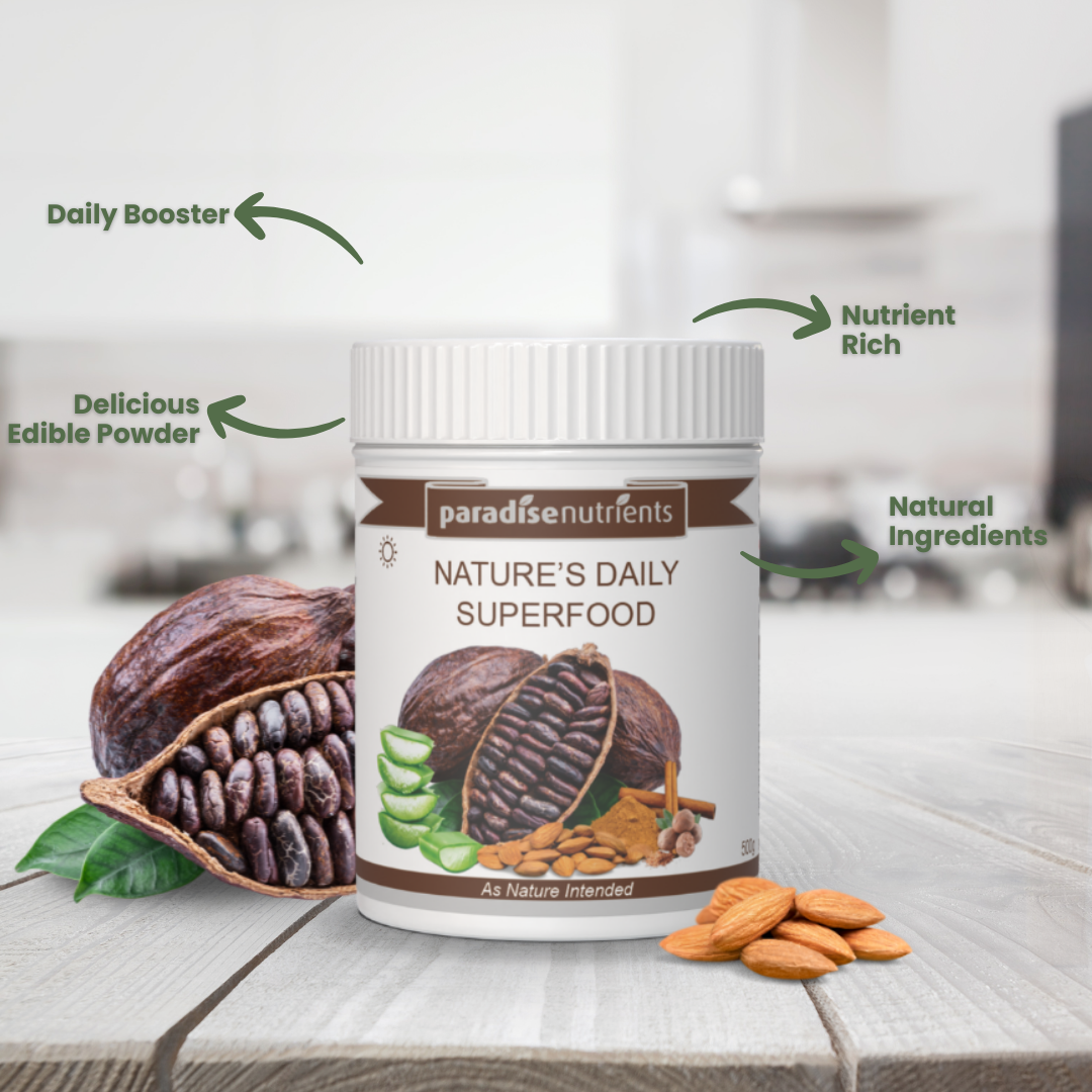 Unleash the power of Nature's Daily Superfood - an extraordinary and delectable blend designed for ultimate nourishment. Indulge in this consumable superfood, a true delight for your taste buds, as it works wonders to fortify your immune system, aid in healing, and enhance your digestion. Elevate your daily nutrition with this exceptional superfood and embrace a healthier, more vibrant you!