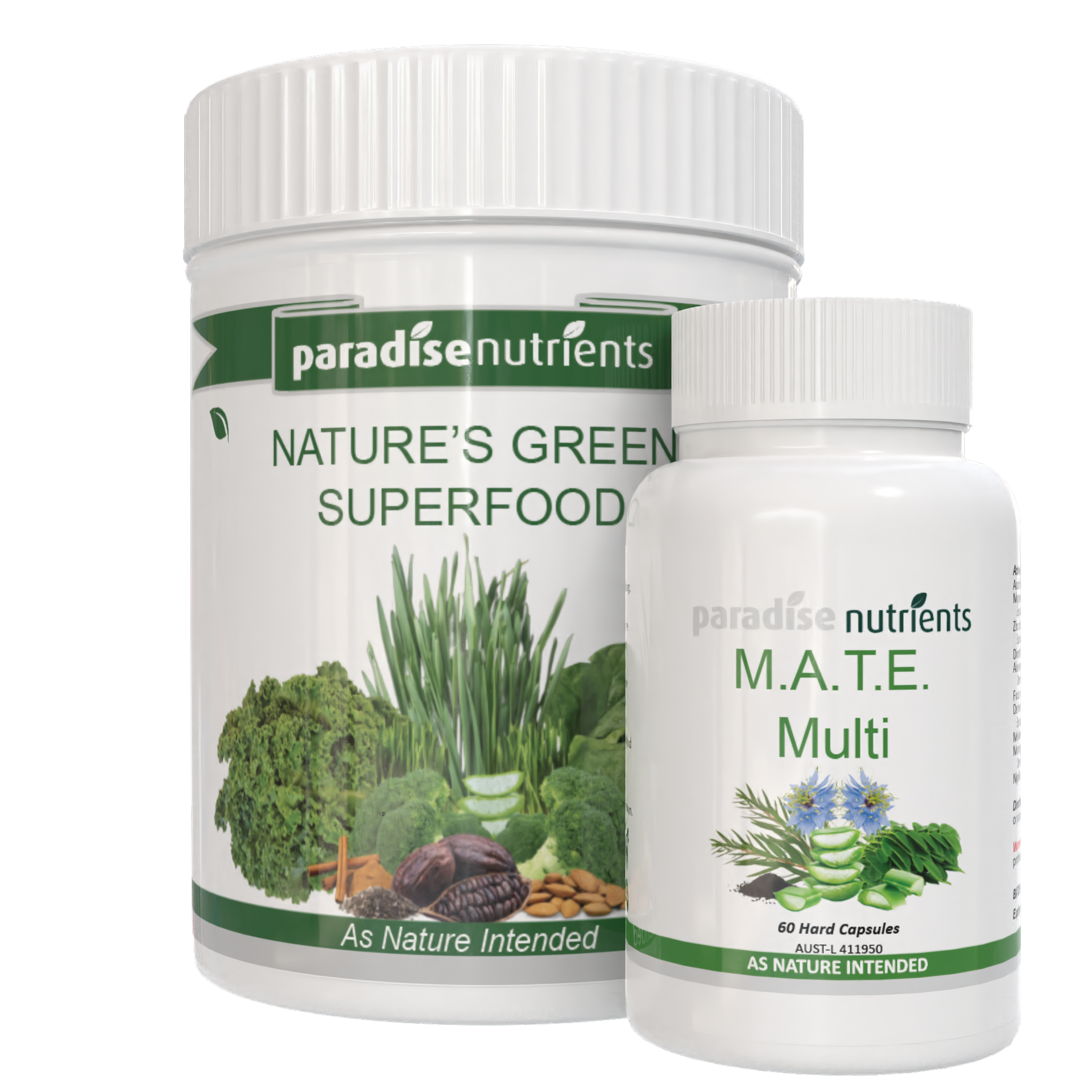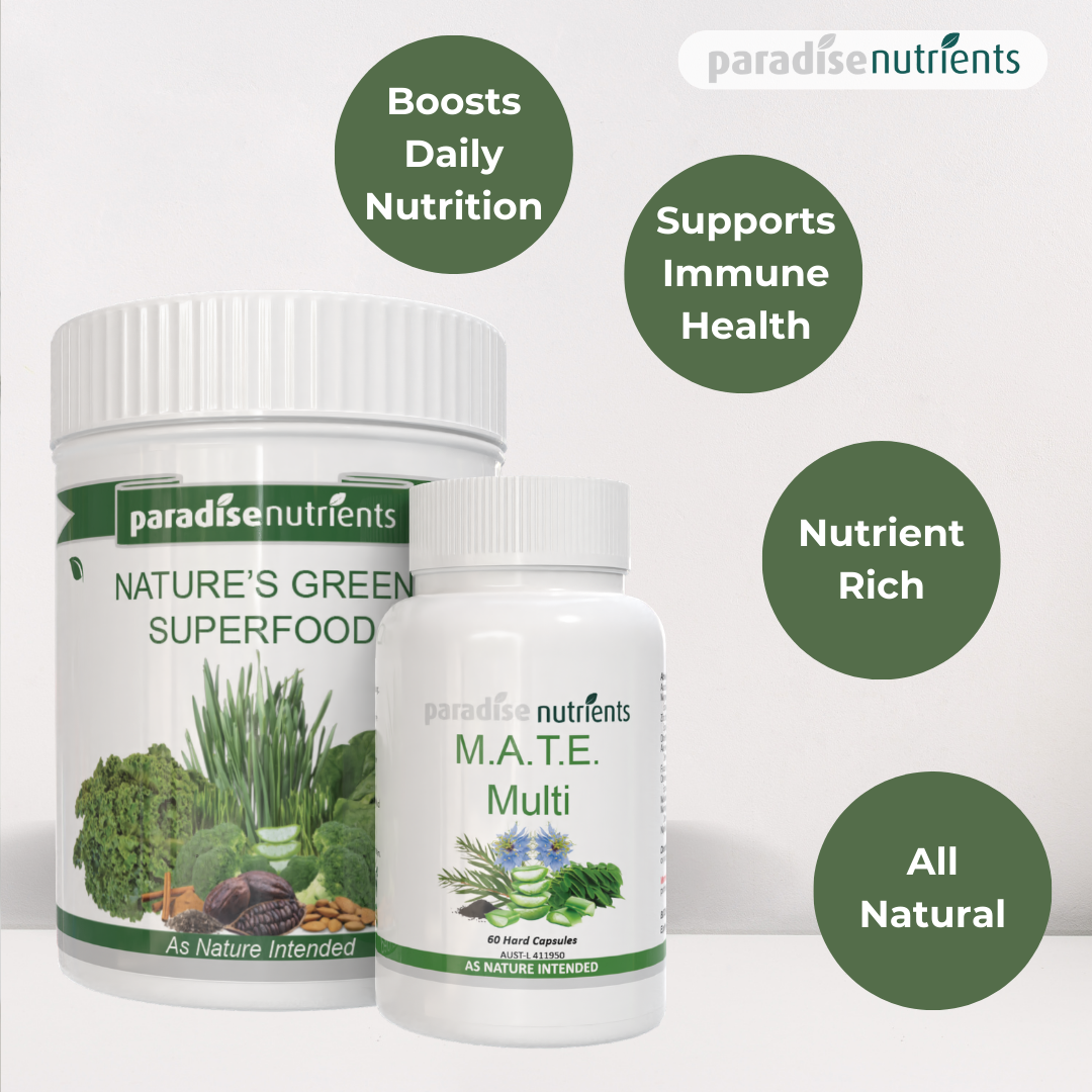 Nutrient Synergy Pack brings together two of Paradise Nutrients’ most powerful supplements, Nature's Green Superfood and M.A.T.E Multi, to enhance the availability of essential nutrients and support overall wellbeing.