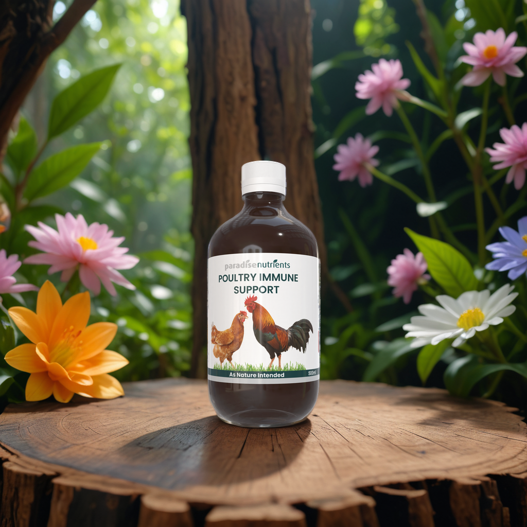 Paradise Nutrients Poultry Immune Support has been designed to be a simple application. By adding a few drops into your chicken’s water gives your chickens a natural extract, immune support. The concept is to assist the immune system so it can recognise and kill off pathogens at an early stage, letting the bird build up a stealthy immune system.