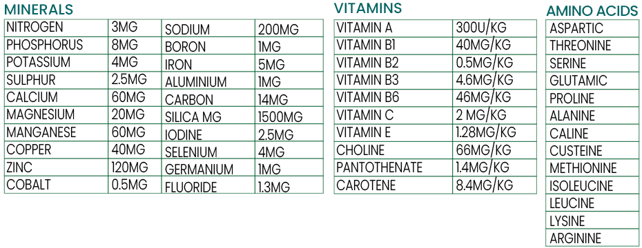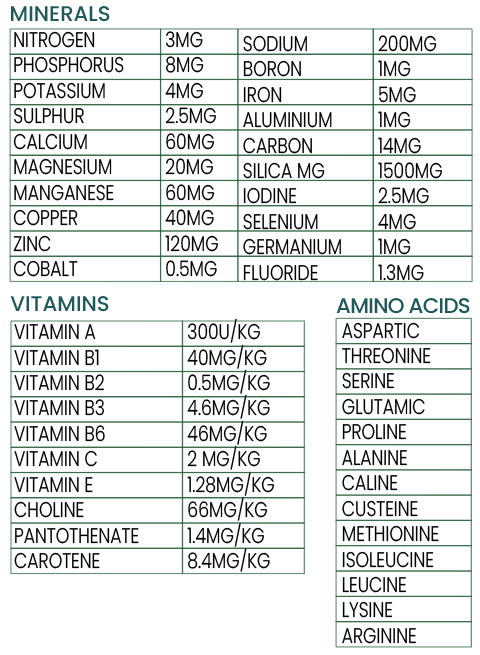 The ingredients in the Premium Blend Horse Minerals have been chosen for their unique combination of organic mineral compounds and the availability to deliver instant bioavailable nutrients to your horse. Minerals in these products have been extracted and derived from sea plants, kelp, age old healing plants, herbs, colloidal minerals, dolomite clay, calcium clay, bentonite clay, diatomite, MSM plant sulphur plus more. The ingredients in this product together contain a broad spectrum of over 74 minerals, 14 amino acids and 10 vitamins.